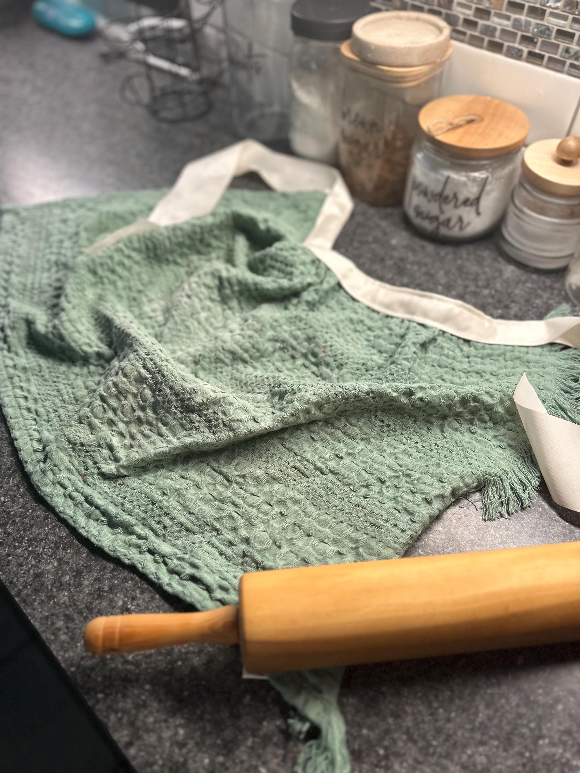Are you like me and always have a hand towel draped over your shoulder when you cook or bake? Like I love the idea of an apron but the neck part always bugs me and the material just doesn’t do the job when I want to wipe off my hands. So hello light bulb! Why not a kitchen towel apron? Seriously how genious right!!??