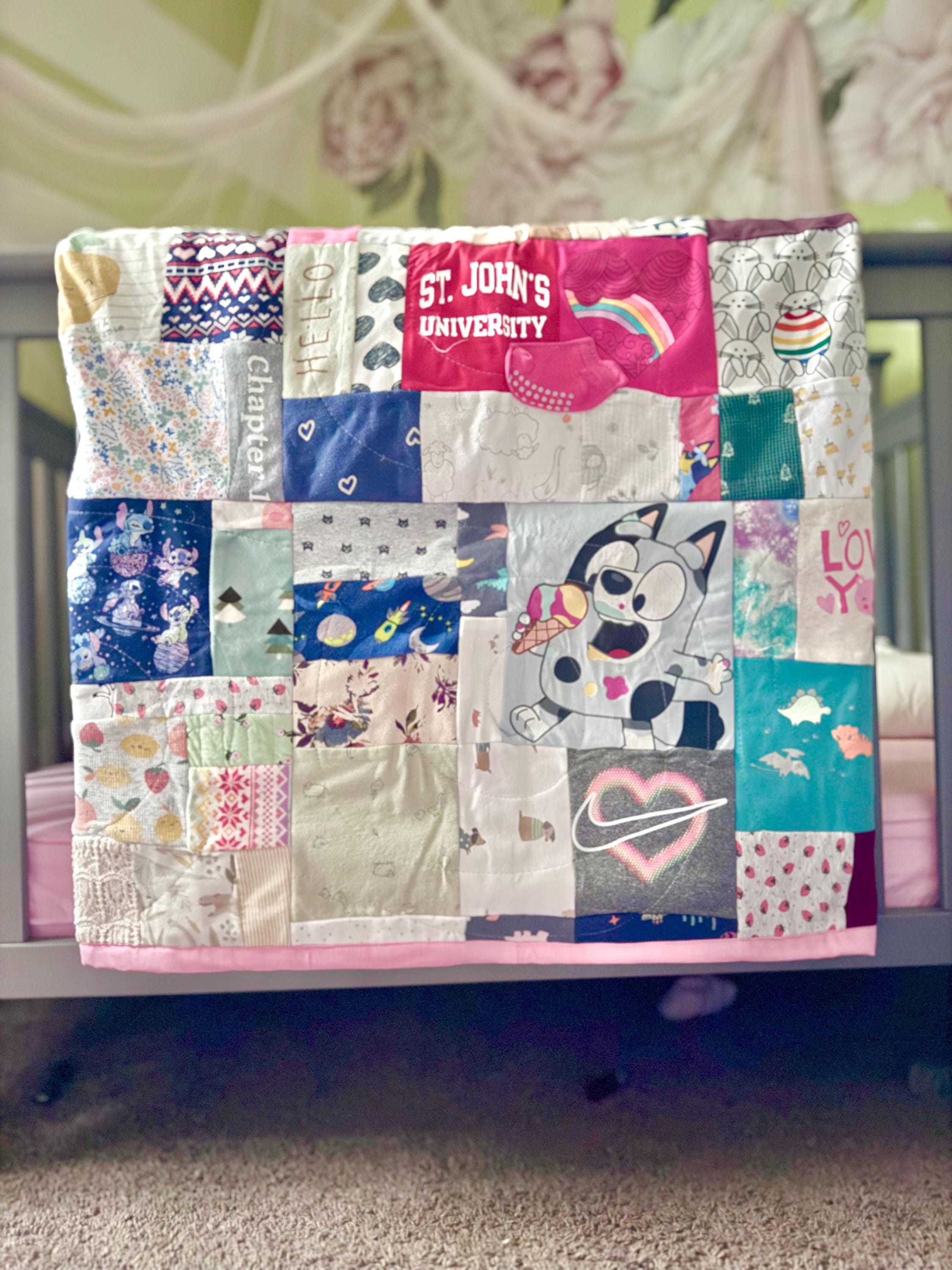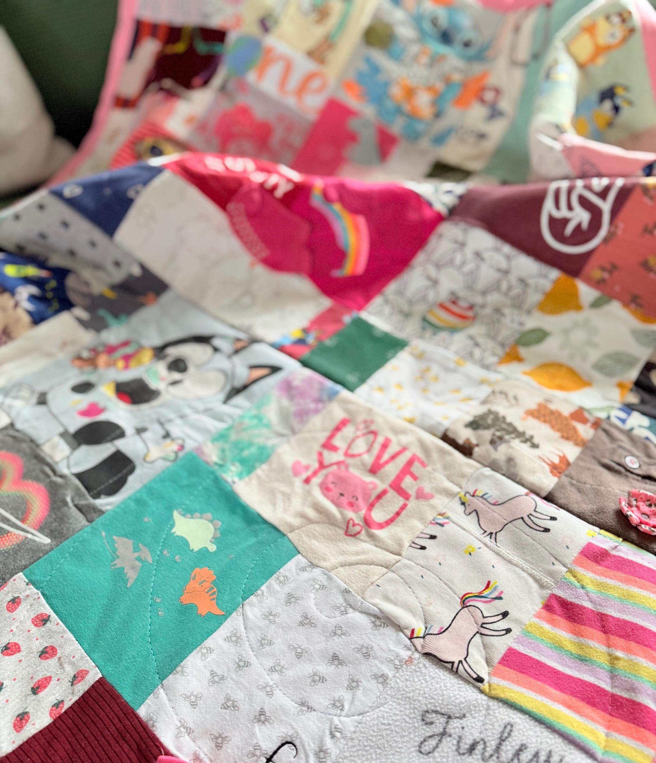 childs and adult memory quilt made from clothing with top stitching , picture quilt baby-kid, great gift option, personalized, onesies,