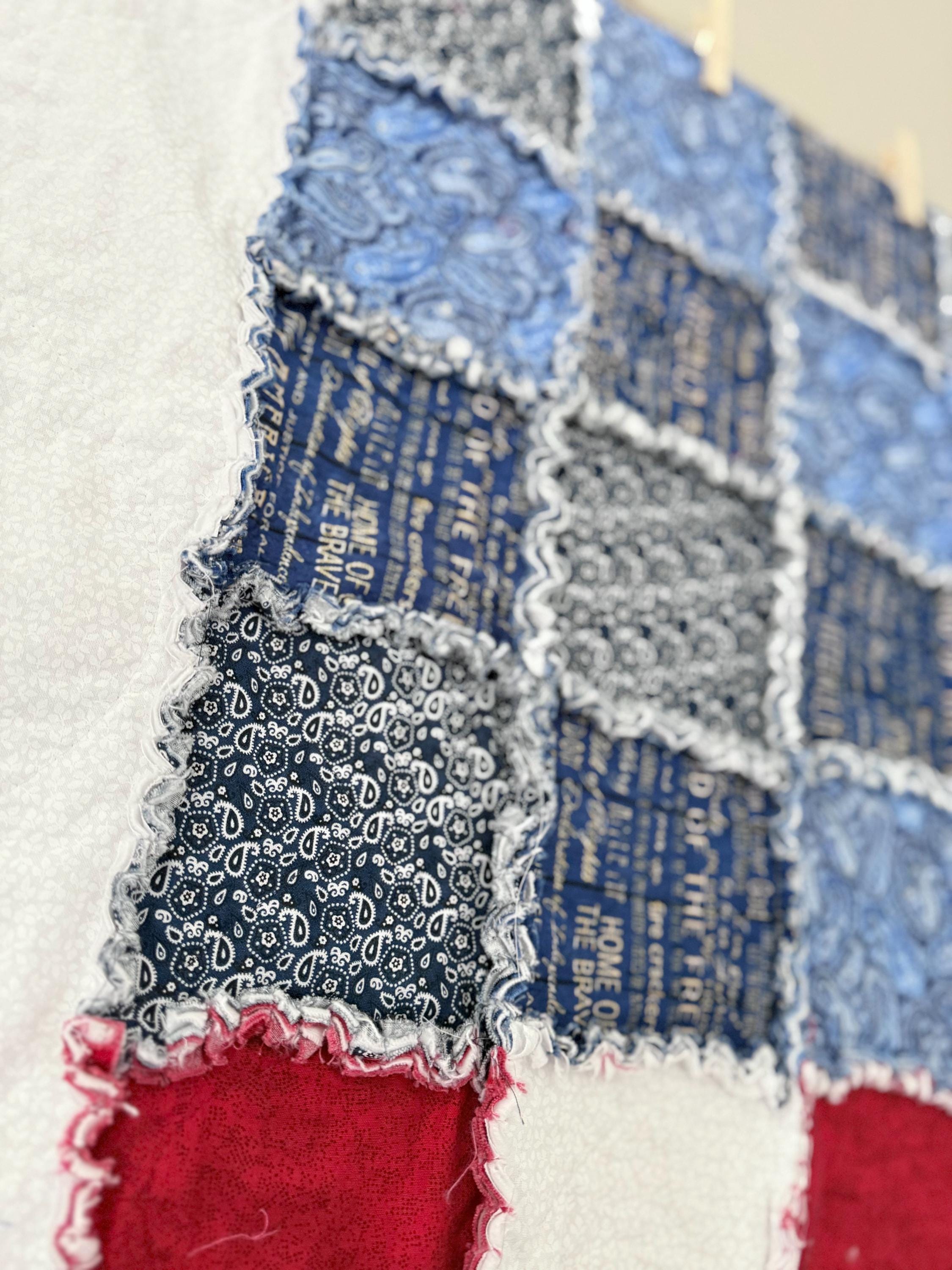 I use cotton fabric in various shades of blue white and red (patterns also) to create this one of a kind rag quilt.