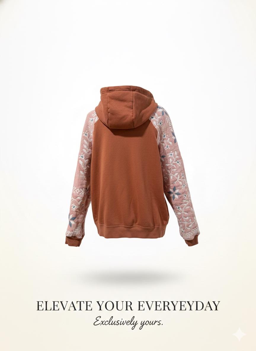 the sweater was used so with that being said, there was somewhere patches on the sweater that I covered with decorative stitching to make it look like a more cohesive piece. I added the decorative stitching on top of the hood by the pocket and on the bottom of the sweater I removed the cuffs from the sweater and created the arms out of the blanket and reattached the cuffs. it is now ready for another hundred thousand mile use!