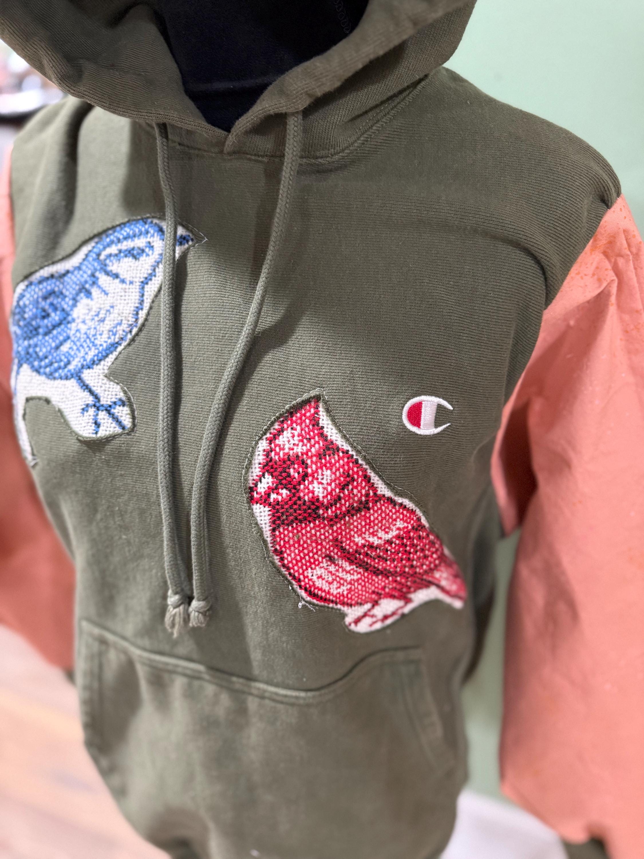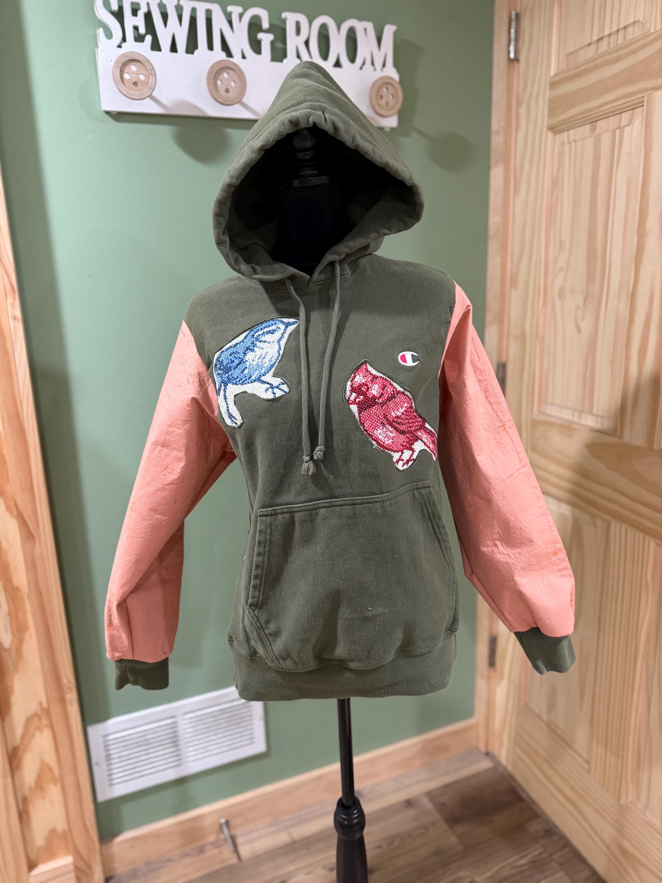 This is a champion hoodie size medium and the blanket was a woven print with super cute birds and bird houses.
