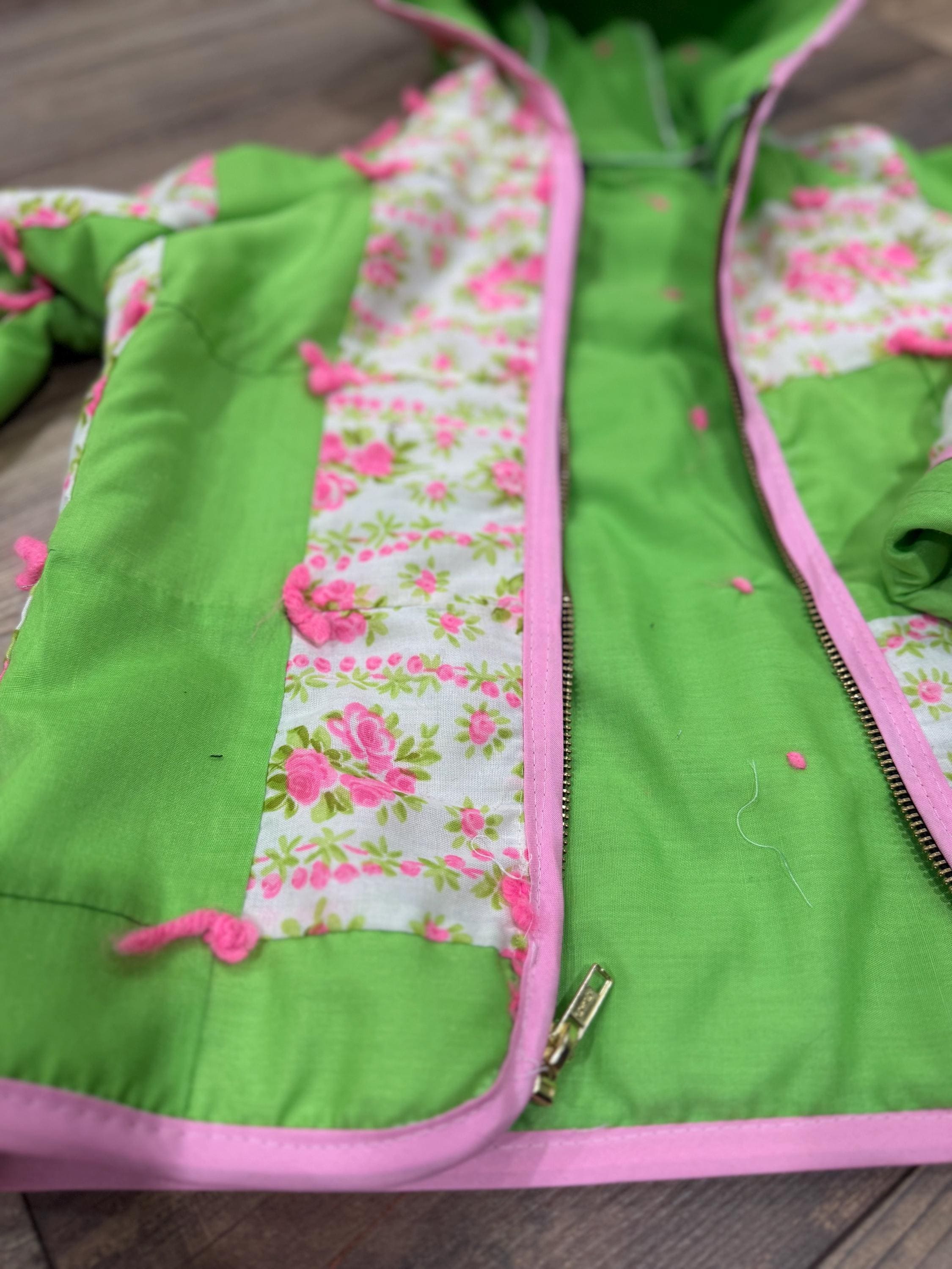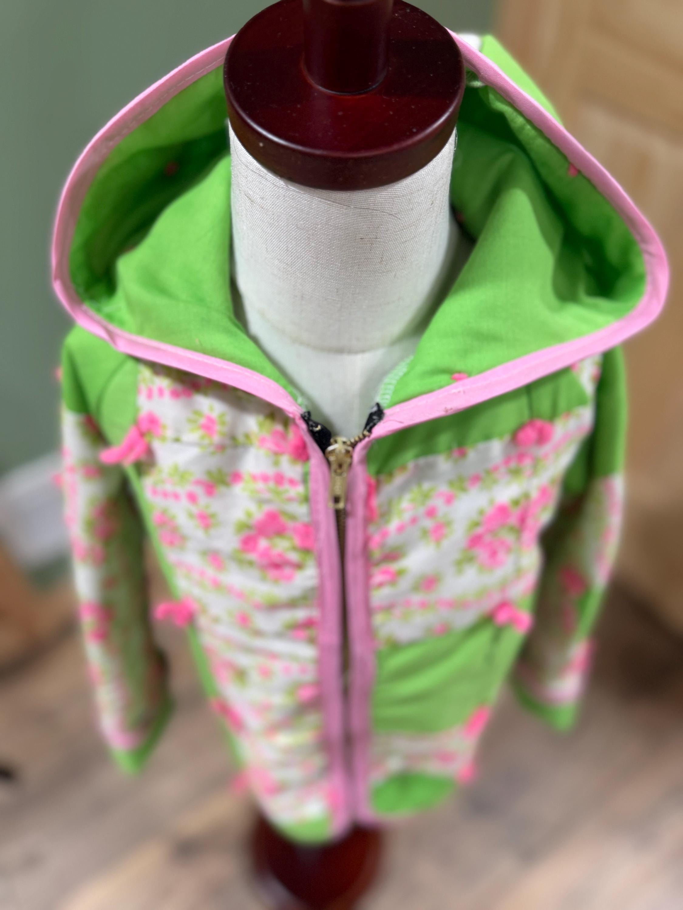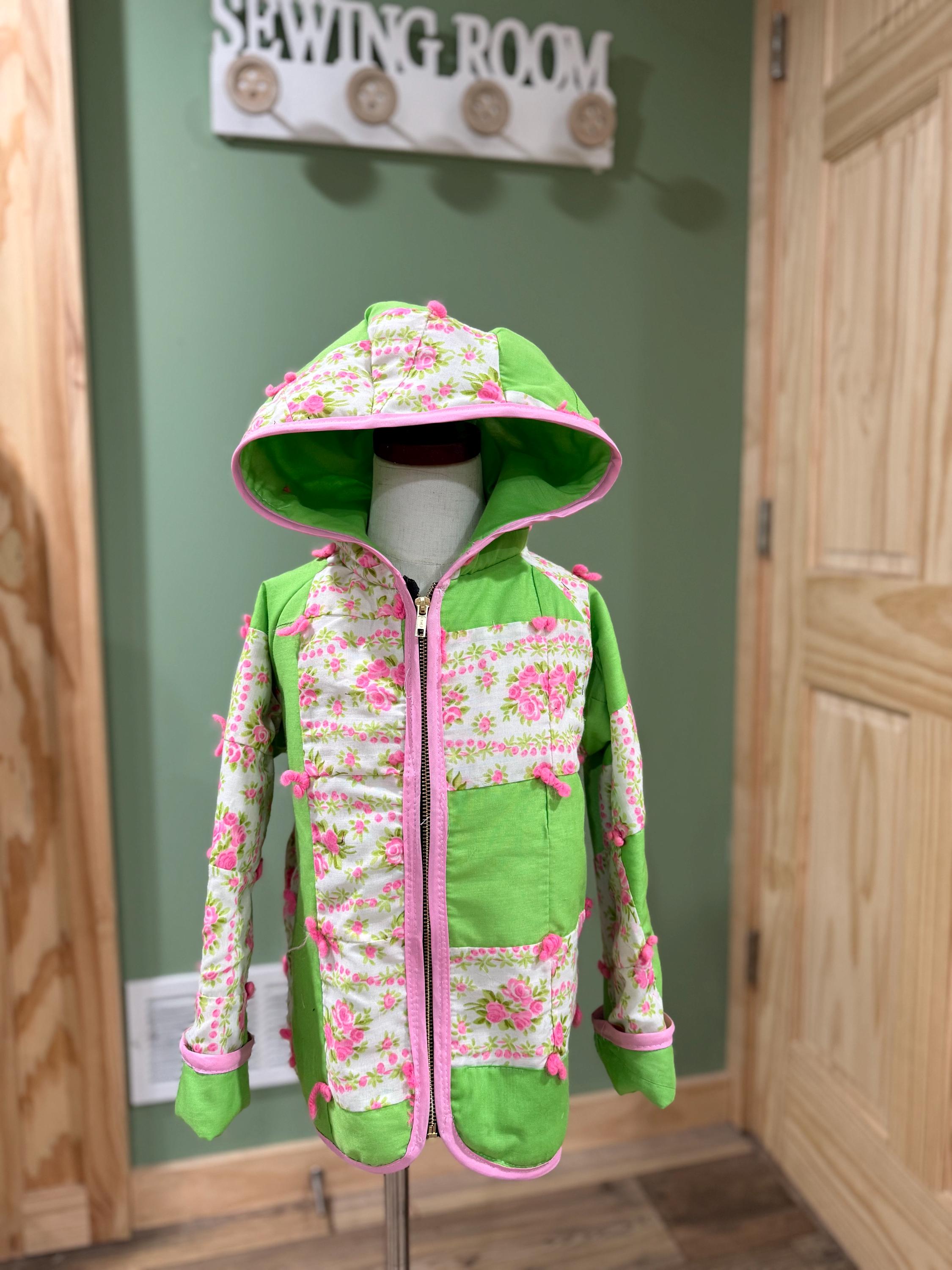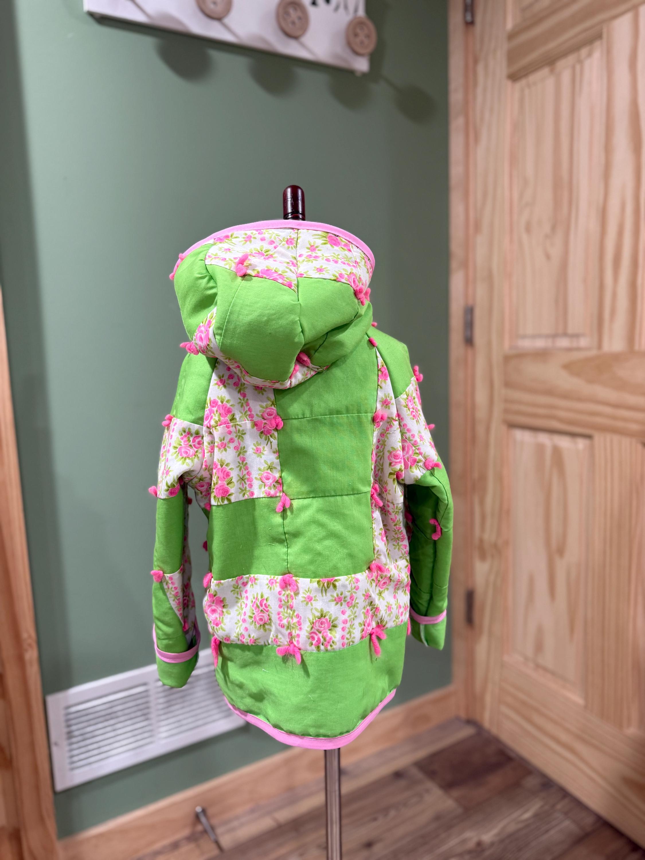 coat has a hood and zipper with a rolled cuff on the sleeves. first thing I said when I seen this was kids coat and I couldn’t be happier!!! the colors and layout are to cute. it was made from someone other than me and I made it into something new!!