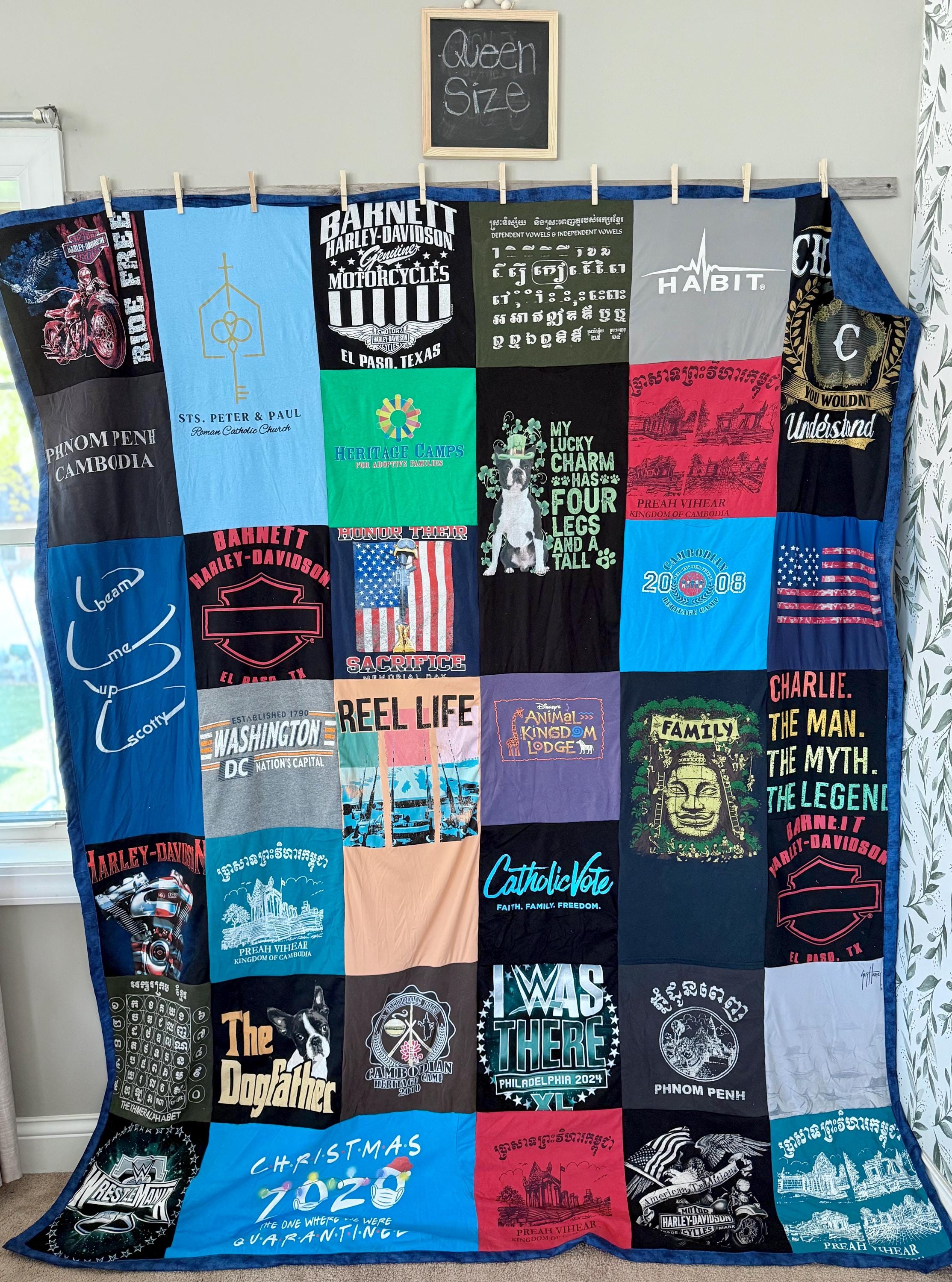 This quilt is gorgeous! It was a birthday gift for my son, on the first birthday he is celebrating since the death of his dad. He loves the way you put together all his dad's T-shirts into such a well made beautiful quilt that he will treasure always. Thank you very much!